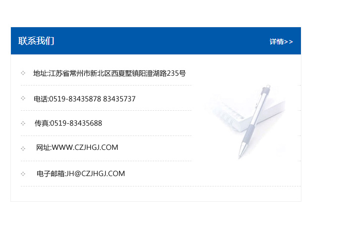 地址:常州市新北區友邦商務大廈1幢16、17層  電話:0519-85101652  傳真:0519-85112595  郵編:213022  網址:www_cz-jiayue_cn.huaqingweb.com  郵箱:xiajifengaa@163.com